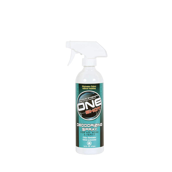 One Shot Deodorizing Spray is the perfect all-in-one spray for pet, home, and family. This spray effectively eliminates unpleasant odors without masking them, while refreshing and deodorizing at the same time. It even works on skun odor! Deodorizing spray is safe for use on dogs, cats, horses, puppies & kittens and can be used throughout the home for effective odor elimination. Ready to use with a refreshing spearmint & peppermint fragrance.