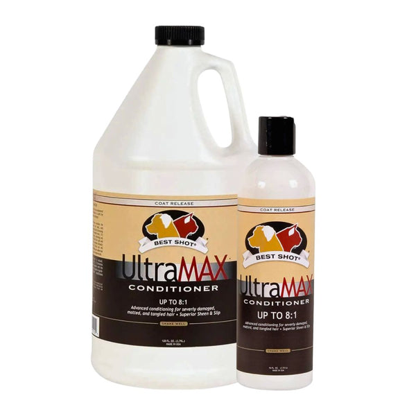 Best Shot UltraMax Conditioner is a technically advanced molecular hydrating formula designed to deeply penetrate the hair cortex while closing the cuticle for enhanced moisture retention and shine. Its unique Coat Release™ technology targets shedding, thick undercoats, and long drop coats, providing the desired slip and flow to ease detangling and reduce matting. This conditioner is highly recommended for severely damaged, matted, and tangled hair, helping restore manageability and softness. Infused with a sophisticated Sweet Pea scent, it combines notes of sweet pea, watery pear, and sheer freesia, complemented by subtle hints of berry and soft musk, leaving the coat refreshed and lightly fragranced. Dilutes 8:1.