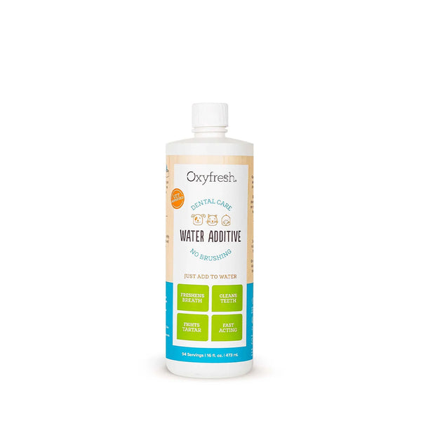 Most pets hate having their teeth brushed. Thankfully, Oxyfresh has pioneered a “No Brush Solution” for your furry friend. Finally, pet home dental care made easy! This non-toxic water additive is for both dogs and cats. The patented blend of Oxygene and zinc safely neutralizes bad breath and helps improve overall dental health, protecting them from periodontal disease, plaque and gingivitis. Completely tasteless and odorless, even the most persnickety of pets can't detect it.