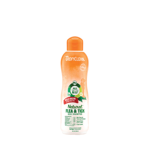 TropiClean Natural Flea & Tick Maximum Strength Shampoo kills fleas, ticks and mosquitoes by contact. Our maximum strength formula repels fleas for up to 7 days. This natural essential blend contains some of nature's most powerful pest fighting ingredients, maximized with lemongrass and sesame oil, for long lasting effects. Powerful and effect but safe enough for routine pet baths on dogs, cats and puppies 12 weeks and older.