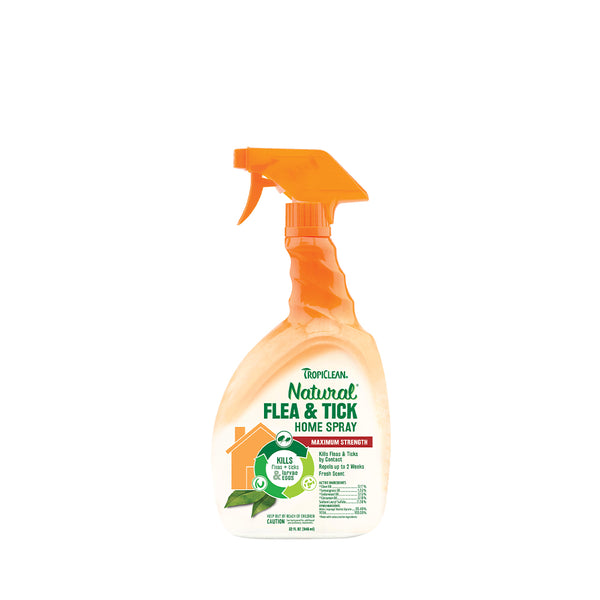 Kill fleas and ticks using natural ingredients with TropiClean Natural Flea & Tick Home Spray. Made with a blend of powerful, natural oils including clove, lemon grass, cedarwood and cinnamon oils, TropiClean Natural Flea & Tick Home Spray is guaranteed to kill fleas and ticks by contact and repels for up to two weeks. It is safe to use on dogs and puppies 12 weeks and older.