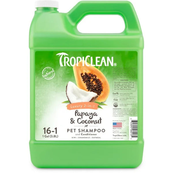 Tropiclean Papaya & Coconut (Luxury 2 in 1) Shampoo offers your pet a nourishing wash with a rich, indulgent foam. The blend of papaya and kiwi helps restore the skin and coat's natural moisture balance. Botanical conditioners enhance shine and protect against dryness and tangles. Regular use supports a soft, glossy coat and healthy skin appearance.